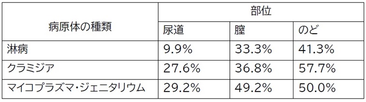 男性の淋病は昔から強い尿道痛、多量の膿の症状が有名ですが、その淋菌性尿道炎でさえ9.9%の方が無症状で見つかります(図表2)。一般に、どんな病原体においても、男性の尿道は比較的症状を来たしやすいことが知られており、女性の膣や男女の咽頭に関してはより多くの無症状保菌者様がいらっしゃいます(図表3)。