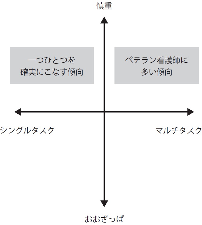 看護師のキャラクターによって、問診内容には多少のブレが生じます。そこで、看護師のタイプによって対応のやり方を変えるのは良い方法です。看護師のキャラクターを、「慎重―おおざっぱ」「マルチタスク可能―シングルタスクのみ」という2軸で考えてみます【図表】。慎重派の看護師はどんなにベテランになっても、仕事のなかで疑問点があると、その都度私に確認を求めます。