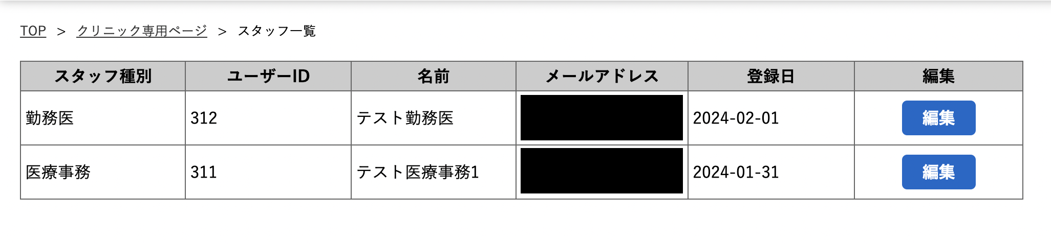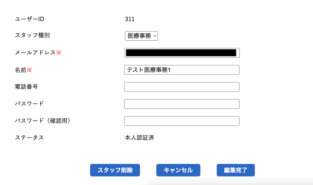 医療事務アカウントでは既に登録されている勤務医/医療事務の「メールアドレス・名前・電話番号・パスワード」の編集、スタッフの削除が可能です。