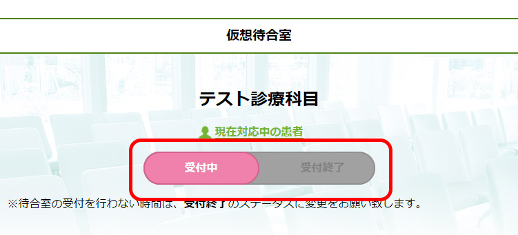 設定している時間以外にオンライン診療を行う場合は、ログイン後、各仮想待合室のトップでステータスを「受付中」に変更してください。患者様の入室通知メールが届くようになります。ログアウト操作をすると、ステータスは「受付終了」に切り替わります。