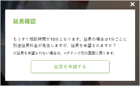 10分間が終了する2分前になると、相談者の画面にこのような表示が出ます。相談者は有料で延長を申請することができます。