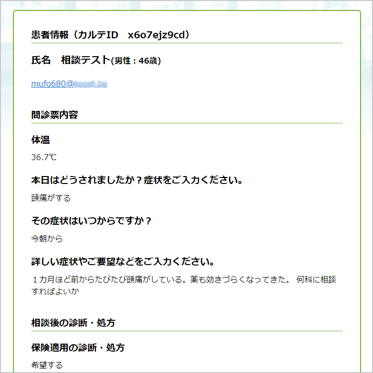 ここでは、問診票に書かれた症状の内容や、相談者から共有された医療情報を確認することができます。(共有される医療情報の項目については「私のカルテ」をご覧ください)