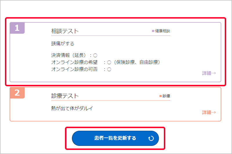仮想待合室では、対応を待っている患者・相談者が一覧表示されています。「患者一覧を更新する」をクリックすると、最新の情報に更新されます。