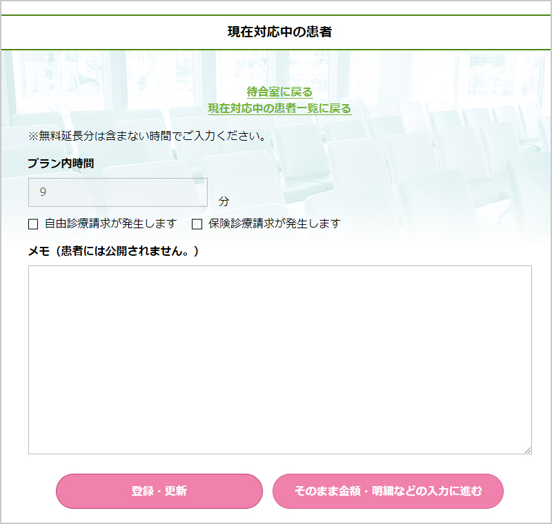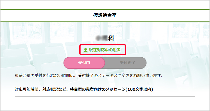 待合室でお待ちの方に向けて、伝たいメッセージなどがある場合は、入力欄に記入し「メッセージを登録・更新する」ボタンをクリックしてください。