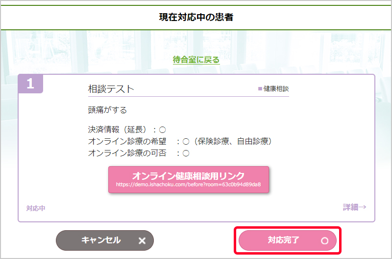 「現在対応中の患者画面へ戻る」をクリックすると、仮想待合室に戻ります。そのまま別の方を受付する画面に進んだり、待合室の状態を確認したりすることができます。