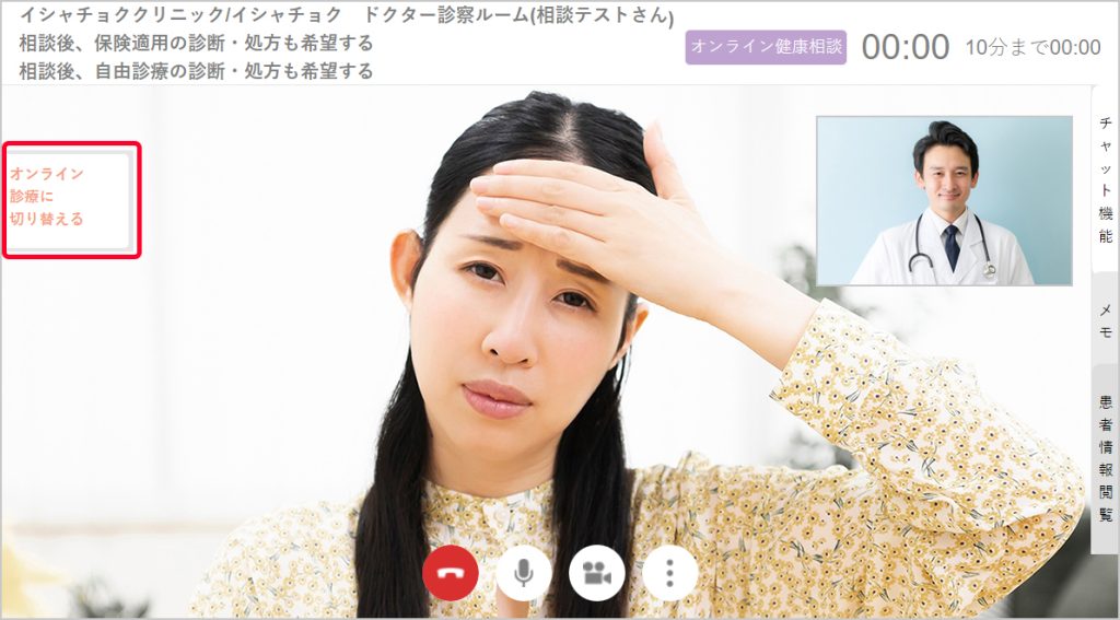 画面の左側に表示されている「オンライン診療に切り替える」というボタンをクリックすると、オンライン診療に移行します。