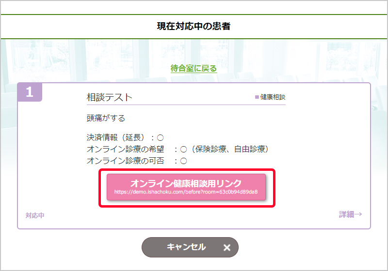 相談者を受付し、通話のためのURLが発行されました。このURLにアクセスすることで、医師・患者ともに通話画面を開くことができます。