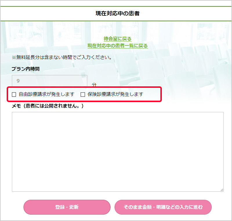 メモ欄は、クリニック内での情報共有等にご活用いただけます。「登録・更新」をクリックすると内容が保存されます。