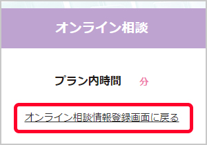 前の画面でチェックを忘れて進んでしまている場合は、オンライン家項相談の通話時間の下に表示されている「オンライン相談情報登録画面に戻る」から、前の画面に戻ることができます。