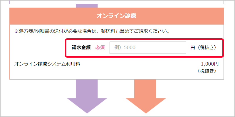 ※オンライン健康相談では、相談時間に応じて発生した患者様への請求金額は自動計算されます。オンライン健康相談からオンライン診療に移行した場合のみ、別途計算した費用を画面に入力してください。この際、オンライン健康相談の料金を合算して入力してしまうことがないようご注意ください。