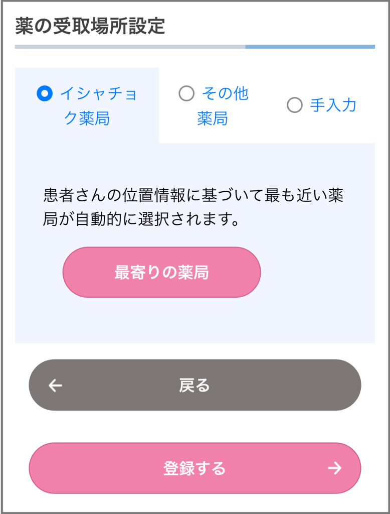 STEP4:「イシャチョク薬局」もしくは「その他薬局」より薬局を登録してください。