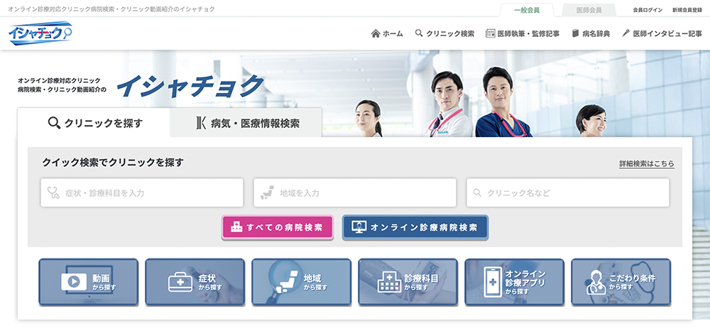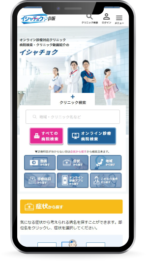 イシャチョク®は、豊富な医療コンテンツをお届けするメディカルプラットフォームです。健康を目指すあなたのために、医療に関する全ての悩みを解決します。病院(クリニック)情報を検索したり、オンライン診療を利用したり、医師の監修による医療記事を読むことができ、健康の向上にお役立ていただけます。