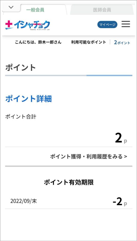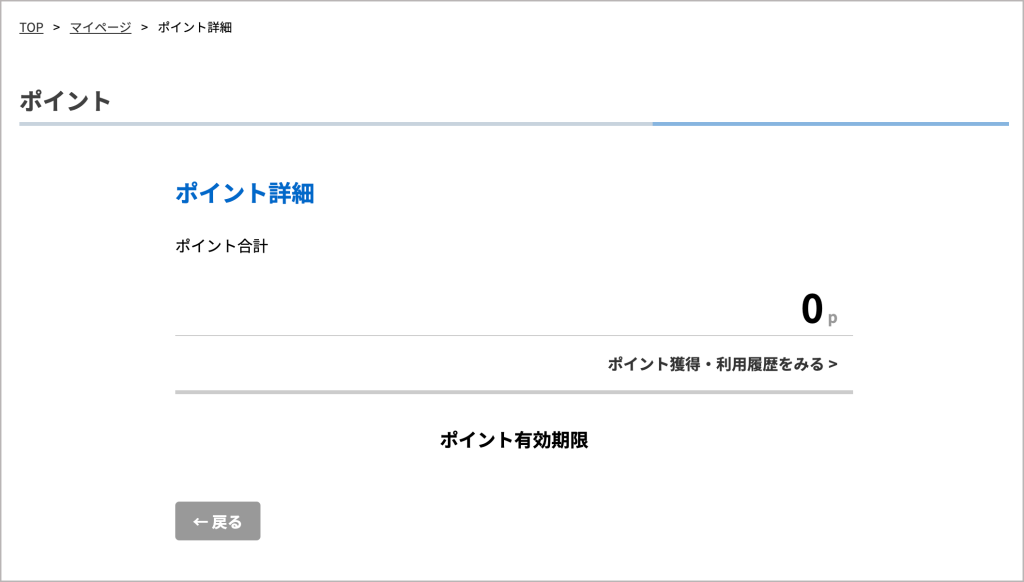 現在のポイントの獲得数、ポイントの有効期限の確認ができます。