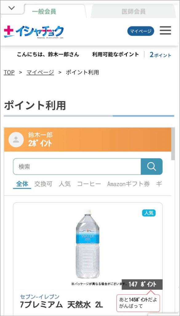 イシャチョク内で獲得したポイントは、飲料や日用品などの景品と交換が可能です。
