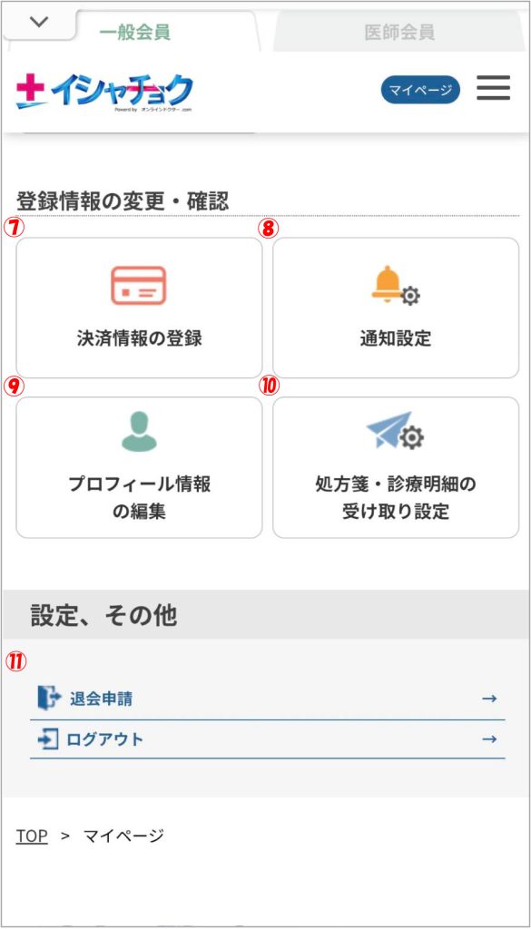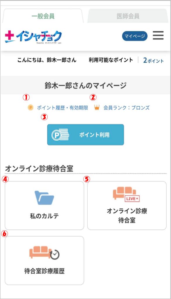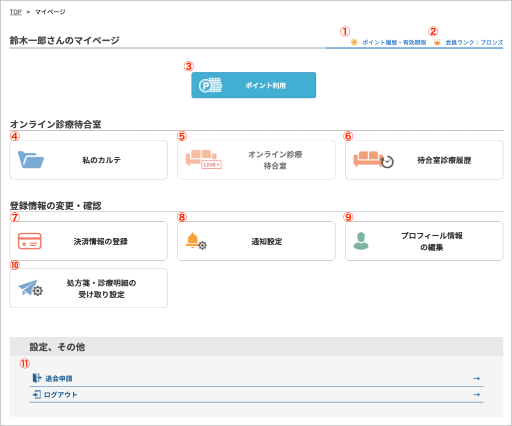 マイページでは登録情報の変更、ポイント・会員ランクの確認、オンライン診療待合室への入室が出来ます。
