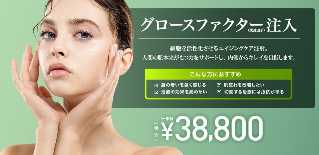 「グロースファクター(成長因子)注入」は、皮膚の細胞分裂を活性化させる成長因子を直接注入し、コラーゲンやエラスチンの生成を促す治療です。