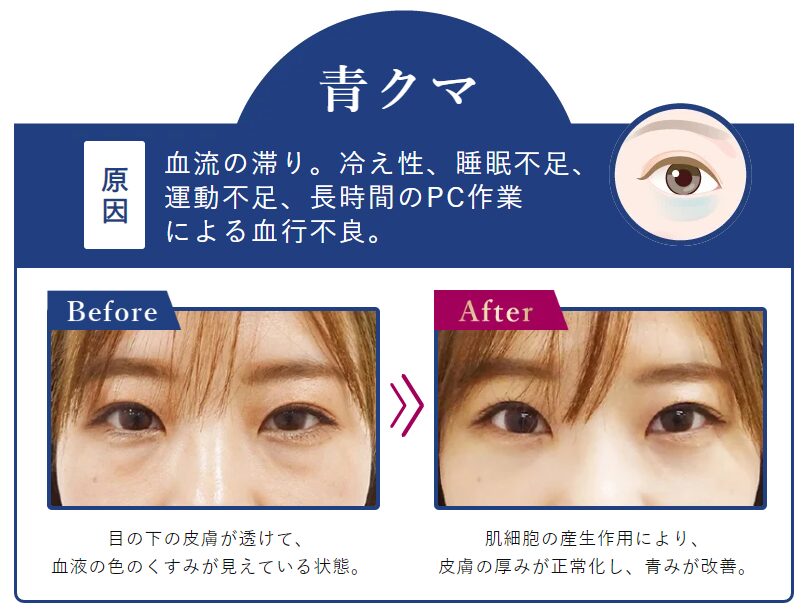皮膚にハリと厚みをもたらすことで、小じわや血管が透ける「青クマ」の改善が期待できます。