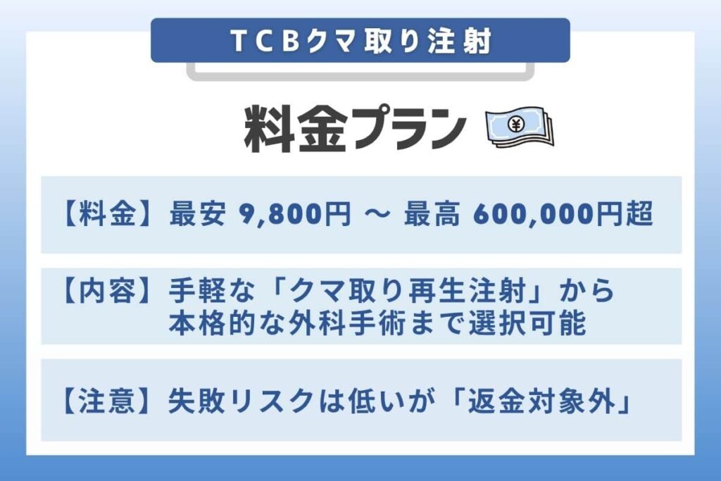 ここでは、TCBで提供されている主なクマ取り施術の一覧と、特に注目される低価格プランの適用条件、そして返金制度について解説します。