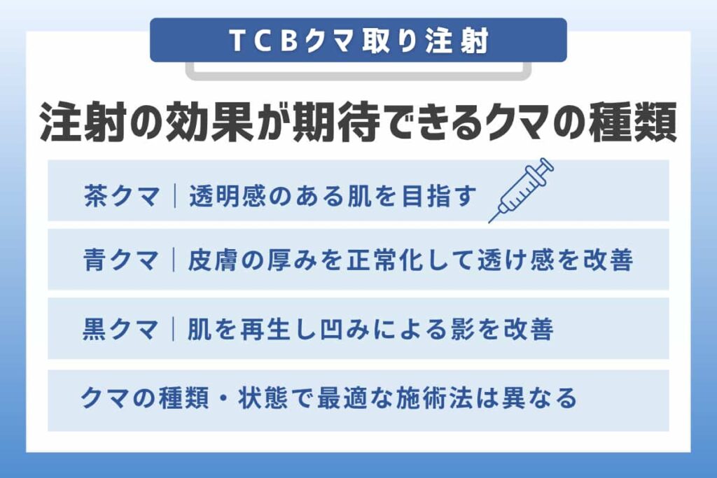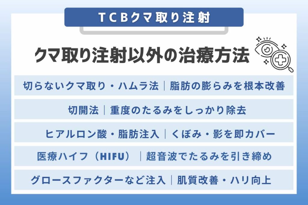 たとえば、TCBの「クマ取り再生注射」は、肌の再生を促してハリを出す治療ですが、物理的に膨らみを取り除く施術ではありません。