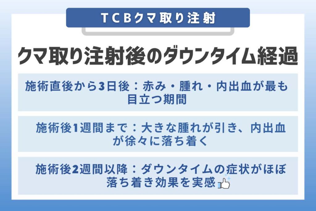 クマ取り再生注射やヒアルロン酸注入のような注入治療の場合、ダウンタイムは数日程度の軽い腫れや内出血で済む場合がほとんどです。