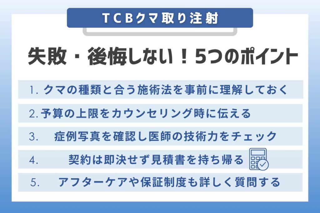 後悔しないためには、自身のクマの種類を理解し、予算を明確に伝えた上で、医師の症例を入念に確認する必要があります。