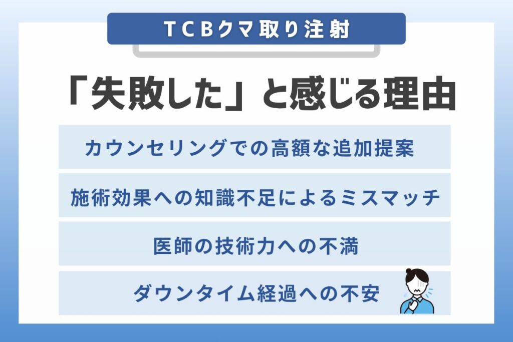 TCBのクマ取りに関するネガティブな口コミを分析すると、「失敗した」と感じる背景にはいくつかの共通した理由が見えてきます。