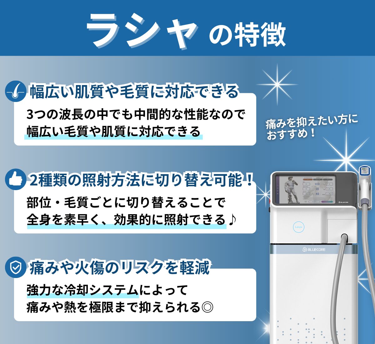 ラシャはアレキサンドライトレーザー、ダイオードレーザー、YAGレーザーを搭載した機械です。