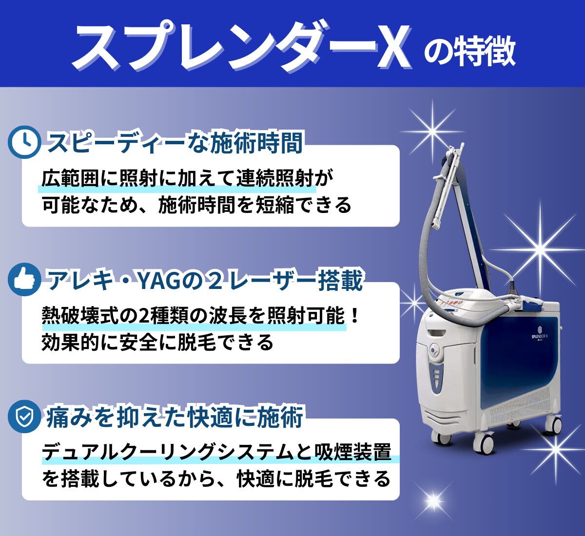 スプレンダーXは、国内初の承認医療用減毛機として20年以上の歴史がある脱毛機です。