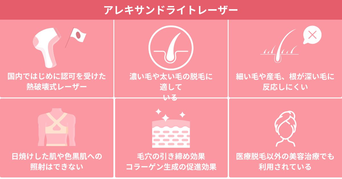 ダイオードレーザー同様、産毛への照射も可能ですが、施術中の痛みが強い特徴があります。