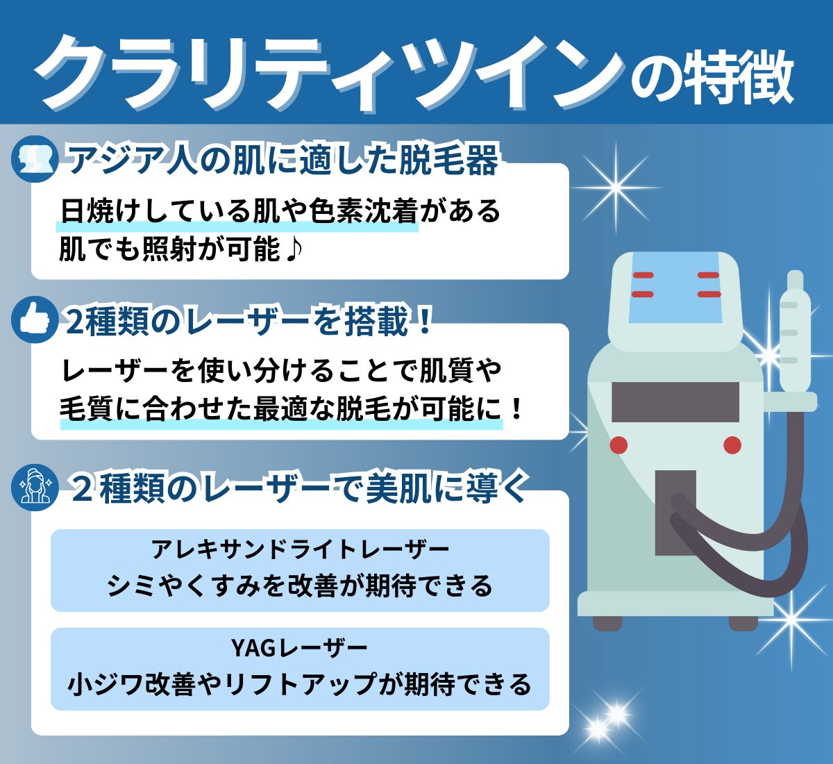 クラリティツインは、アジア人の肌にあわせて開発された医療脱毛機です。