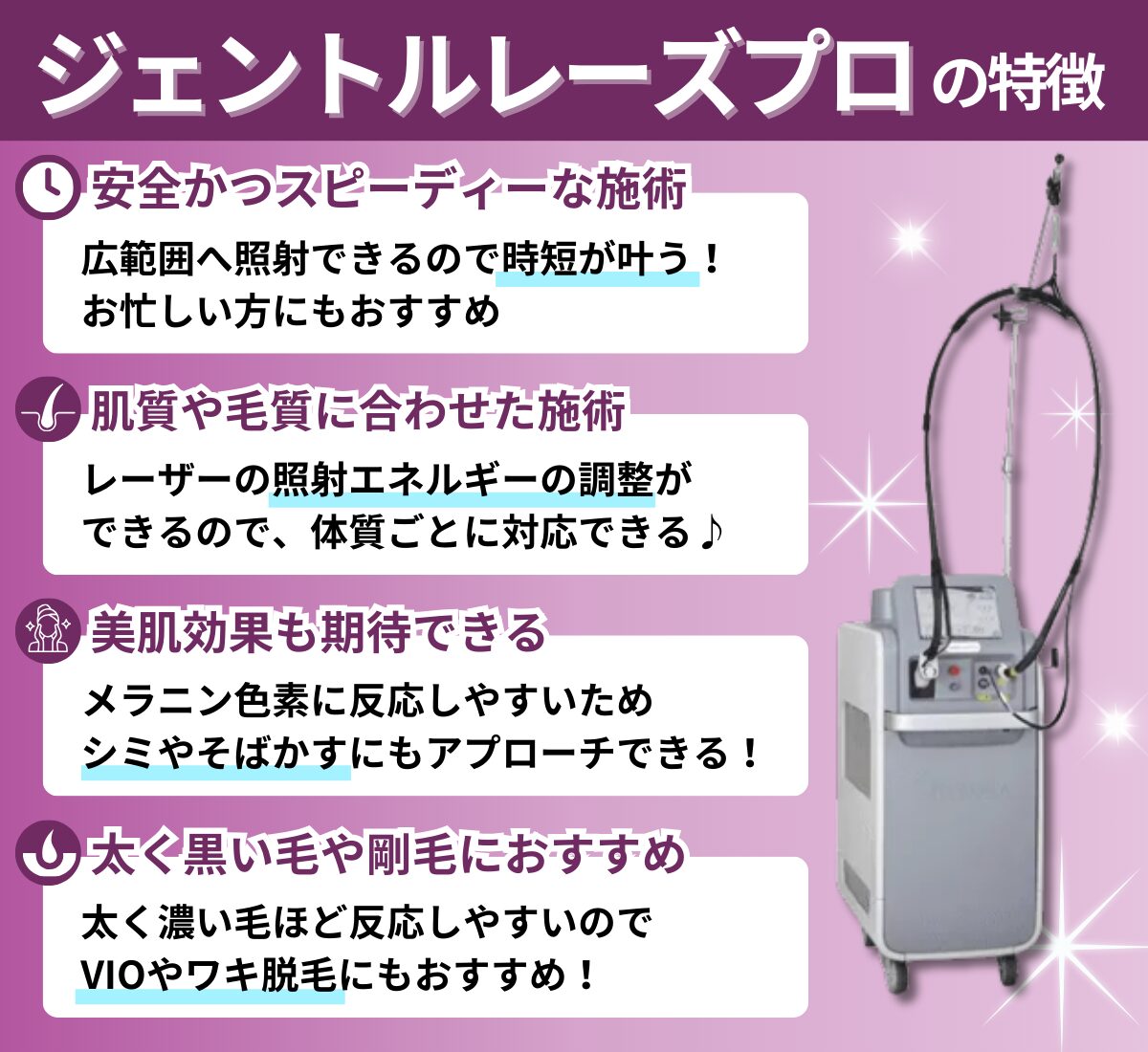 黒く太い毛から産毛、根が深いヒゲやVIOの脱毛にも適しており、日焼け肌や褐色肌にも対応可能です。