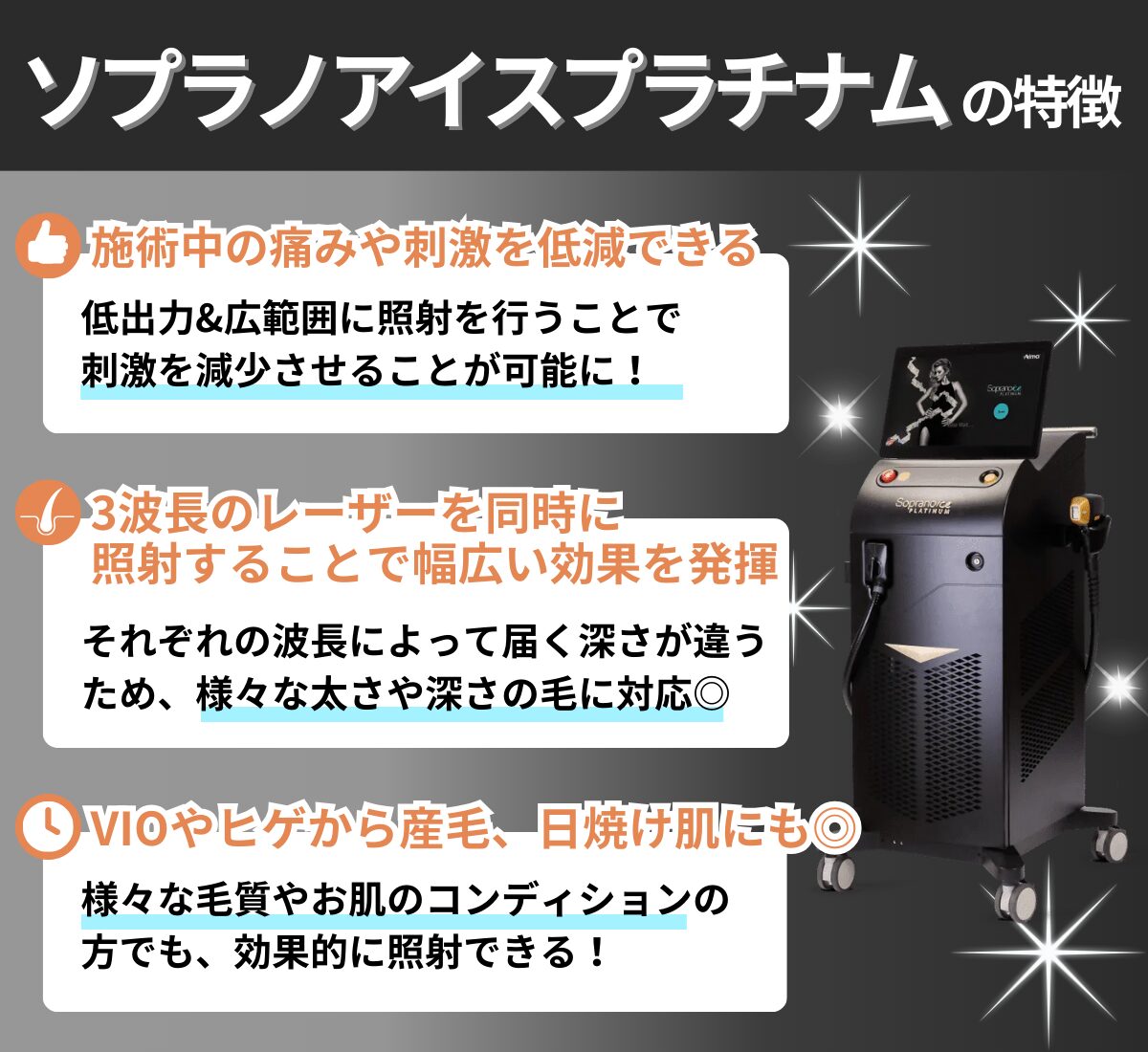 アレキサンドライトレーザー、ダイオードレーザー、YAGレーザーの3波長を同時に照射できます。
