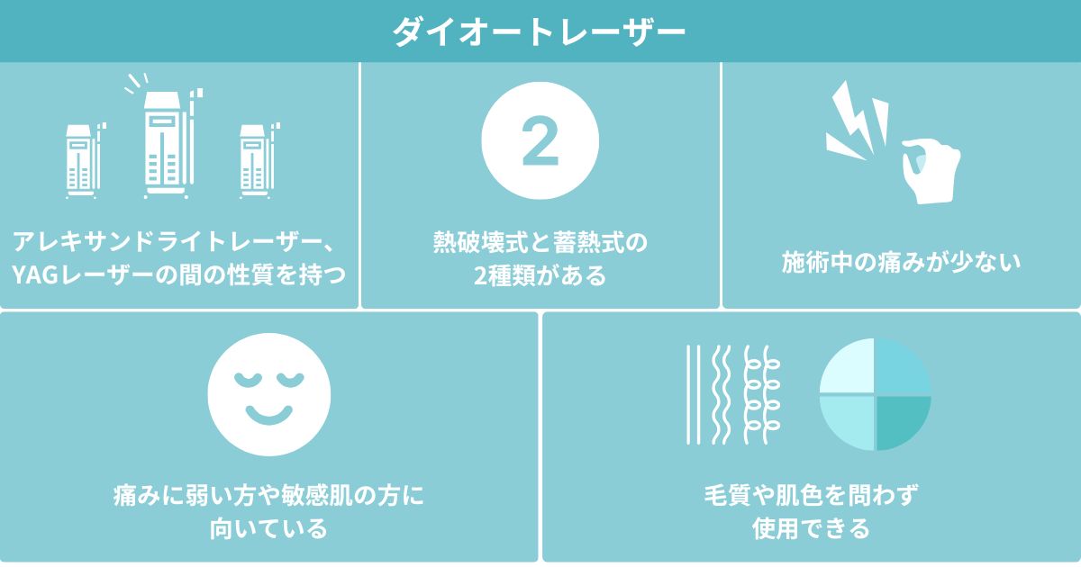 ダイオードレーザーはアレキサンドライトレーザー、YAGレーザーの間の性質を持つレーザーであり、熱破壊式と蓄熱式の2種類があります。