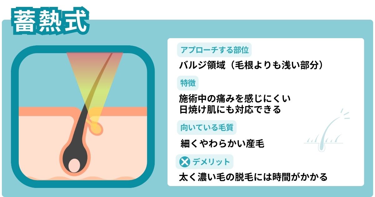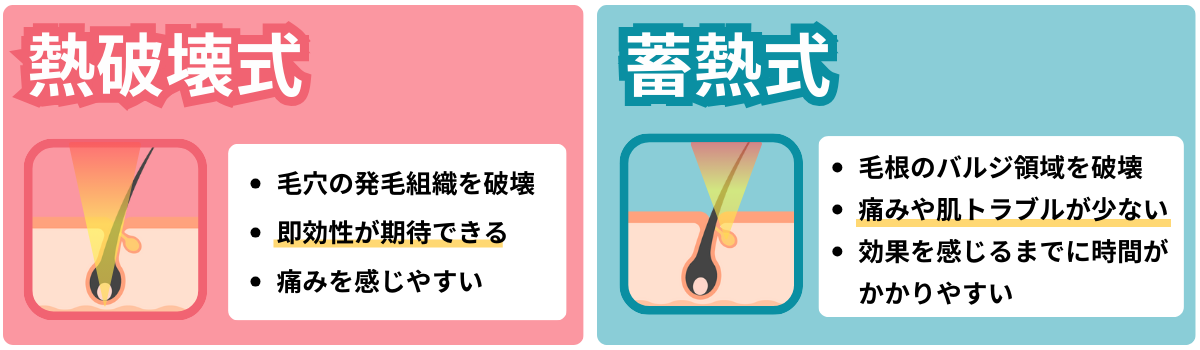 しぶといムダ毛には熱破壊式、産毛や痛みを抑えたい部位は蓄熱式と目的に応じて使い分けることもできます。