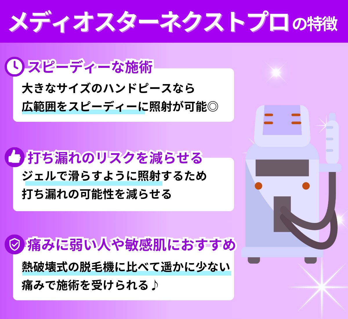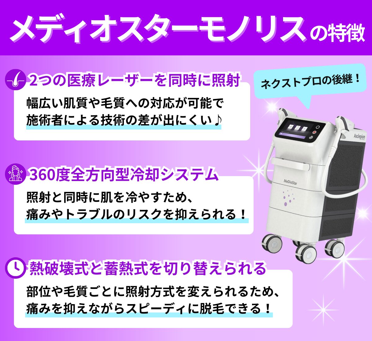 なかでもメディオスターモノリスは、メディオスターNeXT PROの改良版機種で、照射スピードや安全性が向上していることが特徴です。