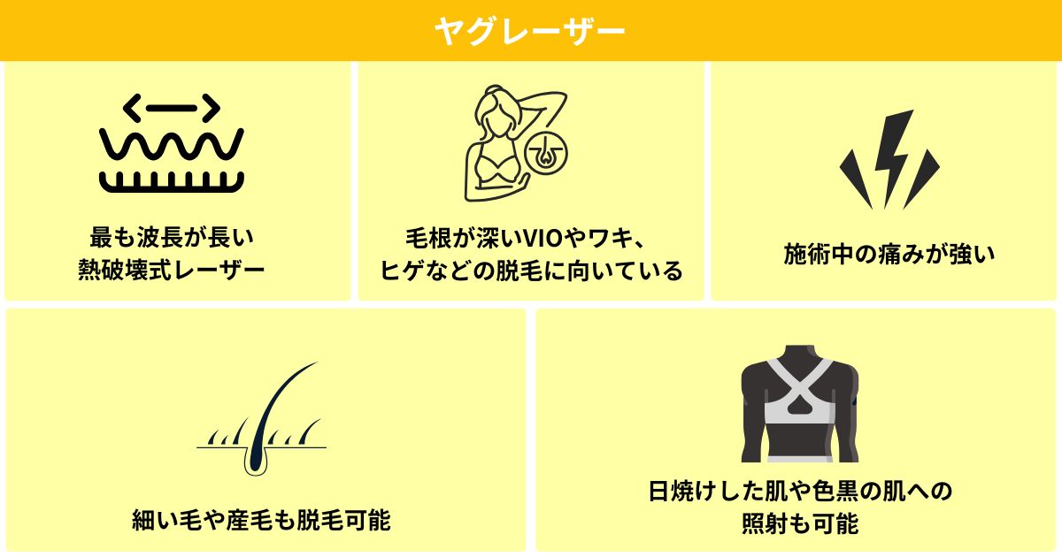 YAGレーザーは、アレキサンドライトレーザーやダイオードレーザーと比べて最も波長が長い熱破壊式レーザーです。