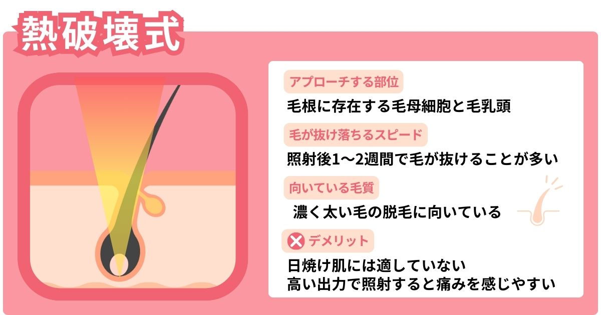 熱破壊式は、毛根に存在する毛母細胞と毛乳頭にレーザーをピンポイントで照射する方法です。