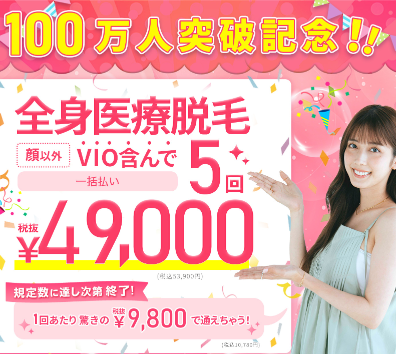全身脱毛は約20万円、VIOや顔の部分脱毛は約90,000円となっています。