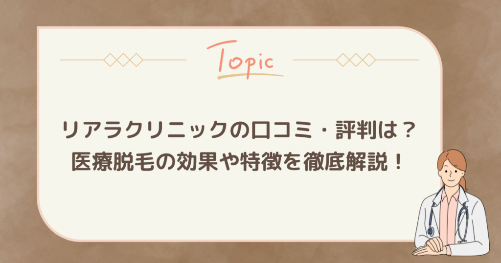 リアラクリニックの悪い口コミや良い口コミについて徹底調査。「効果ない」などの気になる噂について解説しています。 リアラクリニックのリアルな評判や料金プランについて紹介しているので、リアラクリニックで医療脱毛を検討中の方はぜひ参考にしてくだ...